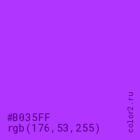 Цвет #B035FF в цветовой модели RGB обозначается тремя октетами (176, 53, 255) в десятичном формате и #B035FF в шестнадцатиричном (hex) формате, которые являются интенсивностью красного 176 (hex B0), интенсивность зелёного 53 (hex 35) и интенсивность синего 255 (hex FF).