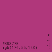 Цвет #B0377B в цветовой модели RGB обозначается тремя октетами (176, 55, 123) в десятичном формате и #B0377B в шестнадцатиричном (hex) формате, которые являются интенсивностью красного 176 (hex B0), интенсивность зелёного 55 (hex 37) и интенсивность синего 123 (hex 7B).