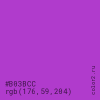Цвет #B03BCC в цветовой модели RGB обозначается тремя октетами (176, 59, 204) в десятичном формате и #B03BCC в шестнадцатиричном (hex) формате, которые являются интенсивностью красного 176 (hex B0), интенсивность зелёного 59 (hex 3B) и интенсивность синего 204 (hex CC).