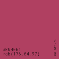 Цвет #B04061 в цветовой модели RGB обозначается тремя октетами (176, 64, 97) в десятичном формате и #B04061 в шестнадцатиричном (hex) формате, которые являются интенсивностью красного 176 (hex B0), интенсивность зелёного 64 (hex 40) и интенсивность синего 97 (hex 61).