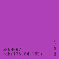 Цвет #B040B7 в цветовой модели RGB обозначается тремя октетами (176, 64, 183) в десятичном формате и #B040B7 в шестнадцатиричном (hex) формате, которые являются интенсивностью красного 176 (hex B0), интенсивность зелёного 64 (hex 40) и интенсивность синего 183 (hex B7).