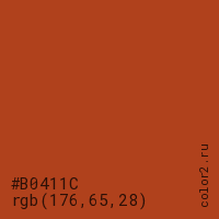 Цвет #B0411C в цветовой модели RGB обозначается тремя октетами (176, 65, 28) в десятичном формате и #B0411C в шестнадцатиричном (hex) формате, которые являются интенсивностью красного 176 (hex B0), интенсивность зелёного 65 (hex 41) и интенсивность синего 28 (hex 1C).