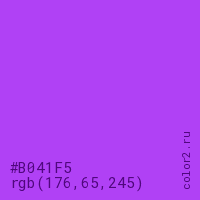 Цвет #B041F5 в цветовой модели RGB обозначается тремя октетами (176, 65, 245) в десятичном формате и #B041F5 в шестнадцатиричном (hex) формате, которые являются интенсивностью красного 176 (hex B0), интенсивность зелёного 65 (hex 41) и интенсивность синего 245 (hex F5).