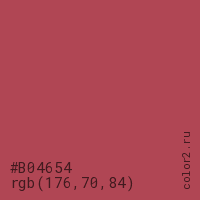 Цвет #B04654 в цветовой модели RGB обозначается тремя октетами (176, 70, 84) в десятичном формате и #B04654 в шестнадцатиричном (hex) формате, которые являются интенсивностью красного 176 (hex B0), интенсивность зелёного 70 (hex 46) и интенсивность синего 84 (hex 54).