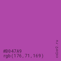 Цвет #B047A9 в цветовой модели RGB обозначается тремя октетами (176, 71, 169) в десятичном формате и #B047A9 в шестнадцатиричном (hex) формате, которые являются интенсивностью красного 176 (hex B0), интенсивность зелёного 71 (hex 47) и интенсивность синего 169 (hex A9).