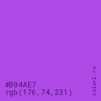 Цвет #B04AE7 в цветовой модели RGB обозначается тремя октетами (176, 74, 231) в десятичном формате и #B04AE7 в шестнадцатиричном (hex) формате, которые являются интенсивностью красного 176 (hex B0), интенсивность зелёного 74 (hex 4A) и интенсивность синего 231 (hex E7).