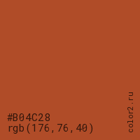 Цвет #B04C28 в цветовой модели RGB обозначается тремя октетами (176, 76, 40) в десятичном формате и #B04C28 в шестнадцатиричном (hex) формате, которые являются интенсивностью красного 176 (hex B0), интенсивность зелёного 76 (hex 4C) и интенсивность синего 40 (hex 28).