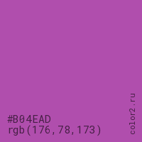 Цвет #B04EAD в цветовой модели RGB обозначается тремя октетами (176, 78, 173) в десятичном формате и #B04EAD в шестнадцатиричном (hex) формате, которые являются интенсивностью красного 176 (hex B0), интенсивность зелёного 78 (hex 4E) и интенсивность синего 173 (hex AD).