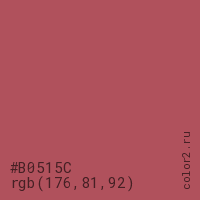 Цвет #B0515C в цветовой модели RGB обозначается тремя октетами (176, 81, 92) в десятичном формате и #B0515C в шестнадцатиричном (hex) формате, которые являются интенсивностью красного 176 (hex B0), интенсивность зелёного 81 (hex 51) и интенсивность синего 92 (hex 5C).