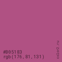 Цвет #B05183 в цветовой модели RGB обозначается тремя октетами (176, 81, 131) в десятичном формате и #B05183 в шестнадцатиричном (hex) формате, которые являются интенсивностью красного 176 (hex B0), интенсивность зелёного 81 (hex 51) и интенсивность синего 131 (hex 83).