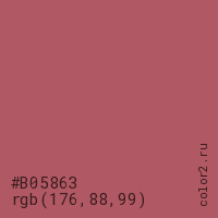 Цвет #B05863 в цветовой модели RGB обозначается тремя октетами (176, 88, 99) в десятичном формате и #B05863 в шестнадцатиричном (hex) формате, которые являются интенсивностью красного 176 (hex B0), интенсивность зелёного 88 (hex 58) и интенсивность синего 99 (hex 63).