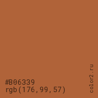 Цвет #B06339 в цветовой модели RGB обозначается тремя октетами (176, 99, 57) в десятичном формате и #B06339 в шестнадцатиричном (hex) формате, которые являются интенсивностью красного 176 (hex B0), интенсивность зелёного 99 (hex 63) и интенсивность синего 57 (hex 39).