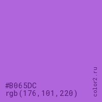 Цвет #B065DC в цветовой модели RGB обозначается тремя октетами (176, 101, 220) в десятичном формате и #B065DC в шестнадцатиричном (hex) формате, которые являются интенсивностью красного 176 (hex B0), интенсивность зелёного 101 (hex 65) и интенсивность синего 220 (hex DC).