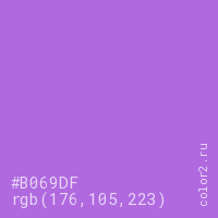 Цвет #B069DF в цветовой модели RGB обозначается тремя октетами (176, 105, 223) в десятичном формате и #B069DF в шестнадцатиричном (hex) формате, которые являются интенсивностью красного 176 (hex B0), интенсивность зелёного 105 (hex 69) и интенсивность синего 223 (hex DF).