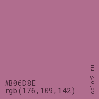Цвет #B06D8E в цветовой модели RGB обозначается тремя октетами (176, 109, 142) в десятичном формате и #B06D8E в шестнадцатиричном (hex) формате, которые являются интенсивностью красного 176 (hex B0), интенсивность зелёного 109 (hex 6D) и интенсивность синего 142 (hex 8E).