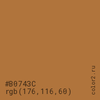 Цвет #B0743C в цветовой модели RGB обозначается тремя октетами (176, 116, 60) в десятичном формате и #B0743C в шестнадцатиричном (hex) формате, которые являются интенсивностью красного 176 (hex B0), интенсивность зелёного 116 (hex 74) и интенсивность синего 60 (hex 3C).