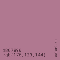 Цвет #B07890 в цветовой модели RGB обозначается тремя октетами (176, 120, 144) в десятичном формате и #B07890 в шестнадцатиричном (hex) формате, которые являются интенсивностью красного 176 (hex B0), интенсивность зелёного 120 (hex 78) и интенсивность синего 144 (hex 90).