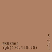 Цвет #B08062 в цветовой модели RGB обозначается тремя октетами (176, 128, 98) в десятичном формате и #B08062 в шестнадцатиричном (hex) формате, которые являются интенсивностью красного 176 (hex B0), интенсивность зелёного 128 (hex 80) и интенсивность синего 98 (hex 62).