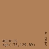 Цвет #B08159 в цветовой модели RGB обозначается тремя октетами (176, 129, 89) в десятичном формате и #B08159 в шестнадцатиричном (hex) формате, которые являются интенсивностью красного 176 (hex B0), интенсивность зелёного 129 (hex 81) и интенсивность синего 89 (hex 59).