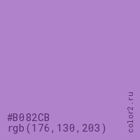 Цвет #B082CB в цветовой модели RGB обозначается тремя октетами (176, 130, 203) в десятичном формате и #B082CB в шестнадцатиричном (hex) формате, которые являются интенсивностью красного 176 (hex B0), интенсивность зелёного 130 (hex 82) и интенсивность синего 203 (hex CB).
