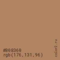 Цвет #B08360 в цветовой модели RGB обозначается тремя октетами (176, 131, 96) в десятичном формате и #B08360 в шестнадцатиричном (hex) формате, которые являются интенсивностью красного 176 (hex B0), интенсивность зелёного 131 (hex 83) и интенсивность синего 96 (hex 60).