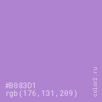 Цвет #B083D1 в цветовой модели RGB обозначается тремя октетами (176, 131, 209) в десятичном формате и #B083D1 в шестнадцатиричном (hex) формате, которые являются интенсивностью красного 176 (hex B0), интенсивность зелёного 131 (hex 83) и интенсивность синего 209 (hex D1).