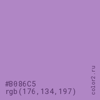 Цвет #B086C5 в цветовой модели RGB обозначается тремя октетами (176, 134, 197) в десятичном формате и #B086C5 в шестнадцатиричном (hex) формате, которые являются интенсивностью красного 176 (hex B0), интенсивность зелёного 134 (hex 86) и интенсивность синего 197 (hex C5).