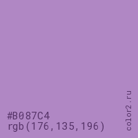 Цвет #B087C4 в цветовой модели RGB обозначается тремя октетами (176, 135, 196) в десятичном формате и #B087C4 в шестнадцатиричном (hex) формате, которые являются интенсивностью красного 176 (hex B0), интенсивность зелёного 135 (hex 87) и интенсивность синего 196 (hex C4).