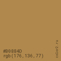 Цвет #B0884D в цветовой модели RGB обозначается тремя октетами (176, 136, 77) в десятичном формате и #B0884D в шестнадцатиричном (hex) формате, которые являются интенсивностью красного 176 (hex B0), интенсивность зелёного 136 (hex 88) и интенсивность синего 77 (hex 4D).