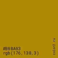 Цвет #B08A03 в цветовой модели RGB обозначается тремя октетами (176, 138, 3) в десятичном формате и #B08A03 в шестнадцатиричном (hex) формате, которые являются интенсивностью красного 176 (hex B0), интенсивность зелёного 138 (hex 8A) и интенсивность синего 3 (hex 03).