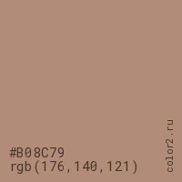 Цвет #B08C79 в цветовой модели RGB обозначается тремя октетами (176, 140, 121) в десятичном формате и #B08C79 в шестнадцатиричном (hex) формате, которые являются интенсивностью красного 176 (hex B0), интенсивность зелёного 140 (hex 8C) и интенсивность синего 121 (hex 79).