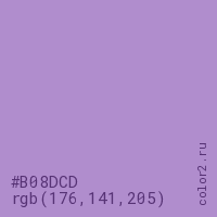 Цвет #B08DCD в цветовой модели RGB обозначается тремя октетами (176, 141, 205) в десятичном формате и #B08DCD в шестнадцатиричном (hex) формате, которые являются интенсивностью красного 176 (hex B0), интенсивность зелёного 141 (hex 8D) и интенсивность синего 205 (hex CD).