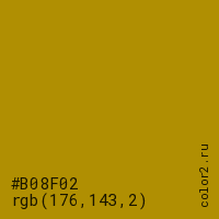 Цвет #B08F02 в цветовой модели RGB обозначается тремя октетами (176, 143, 2) в десятичном формате и #B08F02 в шестнадцатиричном (hex) формате, которые являются интенсивностью красного 176 (hex B0), интенсивность зелёного 143 (hex 8F) и интенсивность синего 2 (hex 02).