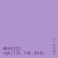 Цвет #B092CC в цветовой модели RGB обозначается тремя октетами (176, 146, 204) в десятичном формате и #B092CC в шестнадцатиричном (hex) формате, которые являются интенсивностью красного 176 (hex B0), интенсивность зелёного 146 (hex 92) и интенсивность синего 204 (hex CC).