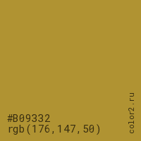 Цвет #B09332 в цветовой модели RGB обозначается тремя октетами (176, 147, 50) в десятичном формате и #B09332 в шестнадцатиричном (hex) формате, которые являются интенсивностью красного 176 (hex B0), интенсивность зелёного 147 (hex 93) и интенсивность синего 50 (hex 32).
