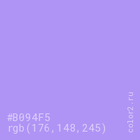 Цвет #B094F5 в цветовой модели RGB обозначается тремя октетами (176, 148, 245) в десятичном формате и #B094F5 в шестнадцатиричном (hex) формате, которые являются интенсивностью красного 176 (hex B0), интенсивность зелёного 148 (hex 94) и интенсивность синего 245 (hex F5).