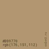 Цвет #B09770 в цветовой модели RGB обозначается тремя октетами (176, 151, 112) в десятичном формате и #B09770 в шестнадцатиричном (hex) формате, которые являются интенсивностью красного 176 (hex B0), интенсивность зелёного 151 (hex 97) и интенсивность синего 112 (hex 70).