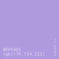 Цвет #B09ADE в цветовой модели RGB обозначается тремя октетами (176, 154, 222) в десятичном формате и #B09ADE в шестнадцатиричном (hex) формате, которые являются интенсивностью красного 176 (hex B0), интенсивность зелёного 154 (hex 9A) и интенсивность синего 222 (hex DE).