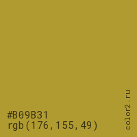 Цвет #B09B31 в цветовой модели RGB обозначается тремя октетами (176, 155, 49) в десятичном формате и #B09B31 в шестнадцатиричном (hex) формате, которые являются интенсивностью красного 176 (hex B0), интенсивность зелёного 155 (hex 9B) и интенсивность синего 49 (hex 31).