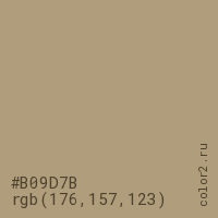 Цвет #B09D7B в цветовой модели RGB обозначается тремя октетами (176, 157, 123) в десятичном формате и #B09D7B в шестнадцатиричном (hex) формате, которые являются интенсивностью красного 176 (hex B0), интенсивность зелёного 157 (hex 9D) и интенсивность синего 123 (hex 7B).