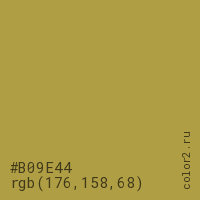 Цвет #B09E44 в цветовой модели RGB обозначается тремя октетами (176, 158, 68) в десятичном формате и #B09E44 в шестнадцатиричном (hex) формате, которые являются интенсивностью красного 176 (hex B0), интенсивность зелёного 158 (hex 9E) и интенсивность синего 68 (hex 44).