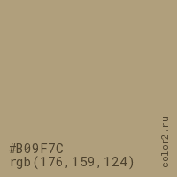 Цвет #B09F7C в цветовой модели RGB обозначается тремя октетами (176, 159, 124) в десятичном формате и #B09F7C в шестнадцатиричном (hex) формате, которые являются интенсивностью красного 176 (hex B0), интенсивность зелёного 159 (hex 9F) и интенсивность синего 124 (hex 7C).
