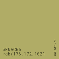 Цвет #B0AC66 в цветовой модели RGB обозначается тремя октетами (176, 172, 102) в десятичном формате и #B0AC66 в шестнадцатиричном (hex) формате, которые являются интенсивностью красного 176 (hex B0), интенсивность зелёного 172 (hex AC) и интенсивность синего 102 (hex 66).