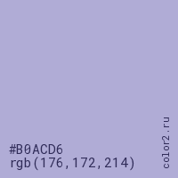 Цвет #B0ACD6 в цветовой модели RGB обозначается тремя октетами (176, 172, 214) в десятичном формате и #B0ACD6 в шестнадцатиричном (hex) формате, которые являются интенсивностью красного 176 (hex B0), интенсивность зелёного 172 (hex AC) и интенсивность синего 214 (hex D6).