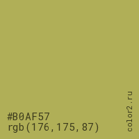 Цвет #B0AF57 в цветовой модели RGB обозначается тремя октетами (176, 175, 87) в десятичном формате и #B0AF57 в шестнадцатиричном (hex) формате, которые являются интенсивностью красного 176 (hex B0), интенсивность зелёного 175 (hex AF) и интенсивность синего 87 (hex 57).