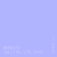 Цвет #B0B3FE в цветовой модели RGB обозначается тремя октетами (176, 179, 254) в десятичном формате и #B0B3FE в шестнадцатиричном (hex) формате, которые являются интенсивностью красного 176 (hex B0), интенсивность зелёного 179 (hex B3) и интенсивность синего 254 (hex FE).