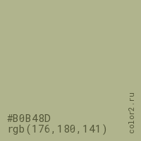 Цвет #B0B48D в цветовой модели RGB обозначается тремя октетами (176, 180, 141) в десятичном формате и #B0B48D в шестнадцатиричном (hex) формате, которые являются интенсивностью красного 176 (hex B0), интенсивность зелёного 180 (hex B4) и интенсивность синего 141 (hex 8D).