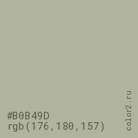 Цвет #B0B49D в цветовой модели RGB обозначается тремя октетами (176, 180, 157) в десятичном формате и #B0B49D в шестнадцатиричном (hex) формате, которые являются интенсивностью красного 176 (hex B0), интенсивность зелёного 180 (hex B4) и интенсивность синего 157 (hex 9D).