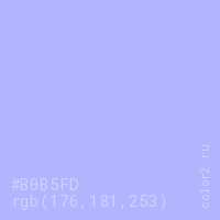 Цвет #B0B5FD в цветовой модели RGB обозначается тремя октетами (176, 181, 253) в десятичном формате и #B0B5FD в шестнадцатиричном (hex) формате, которые являются интенсивностью красного 176 (hex B0), интенсивность зелёного 181 (hex B5) и интенсивность синего 253 (hex FD).