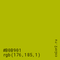 Цвет #B0B901 в цветовой модели RGB обозначается тремя октетами (176, 185, 1) в десятичном формате и #B0B901 в шестнадцатиричном (hex) формате, которые являются интенсивностью красного 176 (hex B0), интенсивность зелёного 185 (hex B9) и интенсивность синего 1 (hex 01).